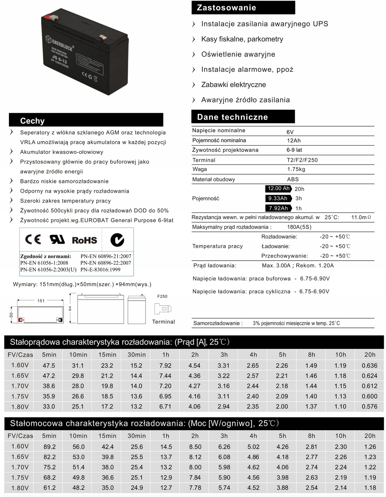 Akumulatory ENERBLOCK z serii JS zostały wyprodukowane w technologii AGM. Są bezobsługowe oraz szczelnie zamknięte (VRLA). Zaprojektowano je do pracy buforowej jako awaryjne źródło energii w instalacjach typu UPS, alarmowych, ppoż, kasach fiskalnych itp. Ich żywotność projektowana to 6-9 lat. Akumulatory z serii JS mają również zastosowanie pracując cyklicznie w takich urządzeniach jak np. zabawki elektryczne, echosondy, itp. Ich żywotność to 500 cykli pracy przy maksymalnym rozładowaniu do poziomu 50%.