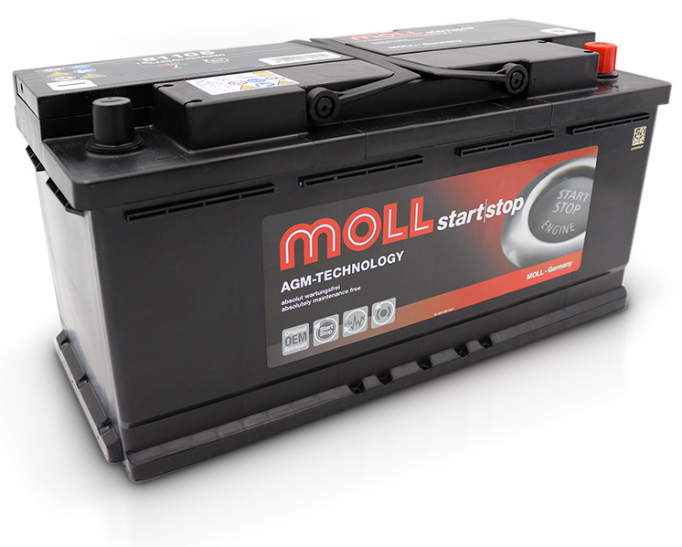 Akumulator MOLL AGM dedykowany jest do silników z funkcją Start – Stop oraz pojazdów z wysokim i długotrwałym zapotrzebowaniem na energię. W technologii AGM elektrolit zaabsorbowany jest w separatorze wykonanym z maty szklanej. Poprzez taki rodzaj wypełnienia przestrzeni międzyelektrodowej zlikwidowano możliwość wycieku elektrolitu z uszkodzonego mechanicznie akumulatora oraz polepszono moc maksymalną akumulatora ze względu na niską rezystancję wewnętrzną tego typu konstrukcji. Ten zamknięty system z opatentowanym rozwiązaniem połączeń miedzygrodziowych gwarantuje wyższy reżim pracy cyklicznej i jest całkowicie bezobsługowy.