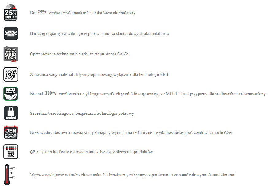 Na rynku akumulatorów turecka firma Mutlu posiada duże doświadczenie w sprzedaży, gwarantując tym samym ich niezawodność. Akumulatory stosowane są na tzw. pierwsze wyposażenie samochodów takich marek jak: Honda, Mercedes, Opel, Hyundai, Toyota, Ford, Renault, a także u innych znanych producentów. Marka oferuje duży asortyment akumulatorów Mutlu, aby każdy mógł dobrać odpowiedni akumulator do swojego auta. To najnowocześniejsze bezobsługowe akumulatory rozruchowe o doskonałej wydajności, oparte na najnowszej technologii AGM –VRLA do samochodów z systemem Start Stop oraz SFB z wydłużonym cyklem życia do samochodów z dużym zapotrzebowaniem energetycznym. Niskie samorozładowanie, wysoka odporność na korozję, solidna i niezawodna obudowa z ochroną przed zwarciami to główne atuty akumulatorów Mutlu.