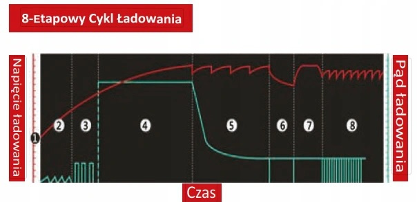 ETAP 8 Ładownie buforowe podtrzymujące - Ładowarka monitoruje napięcie akumulatora i w razie potrzeby dostarcza impuls w celu utrzymania akumulatora w stanie całkowicie naładowanym. Ładowarka podejmuje krótkie ładowania konserwacyjne, rekompensuje samo rozładowanie i przedłuża żywotność akumulatora.