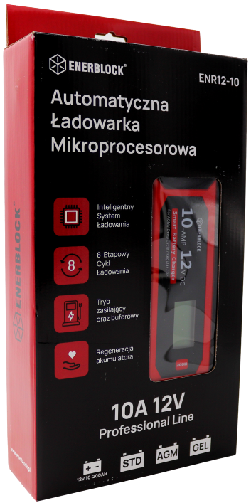 ENERBLOCK ENR12-10 to w pełni automatyczna profesjonalna ładowarka mikroprocesorowa przeznaczona do ładowania tradycyjnych akumulatorów kwasowo-ołowiowych, żelowych (GEL), AGM, EFB (Start-Stop), VRLA o napięciu 12V oraz pojemności od 4AH do 200AH.