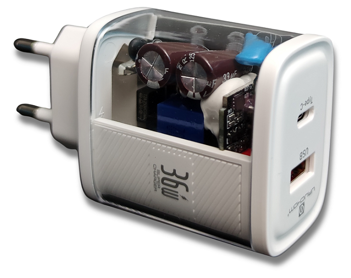 Posiada dwa porty: jeden Type-C oraz jeden USB-A. Jej całkowita moc wyjściowa wynosi 36W.